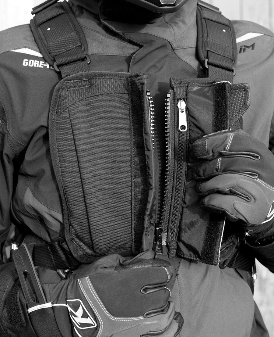 Innovative QUADLOC harness system. Once set - just zip in and out. Harness angled away from underarms for total freedom of movement and no shoulder pull. Chest panel includes 2 x zip pockets and a 3M Scotchlite reflective zip-cover.