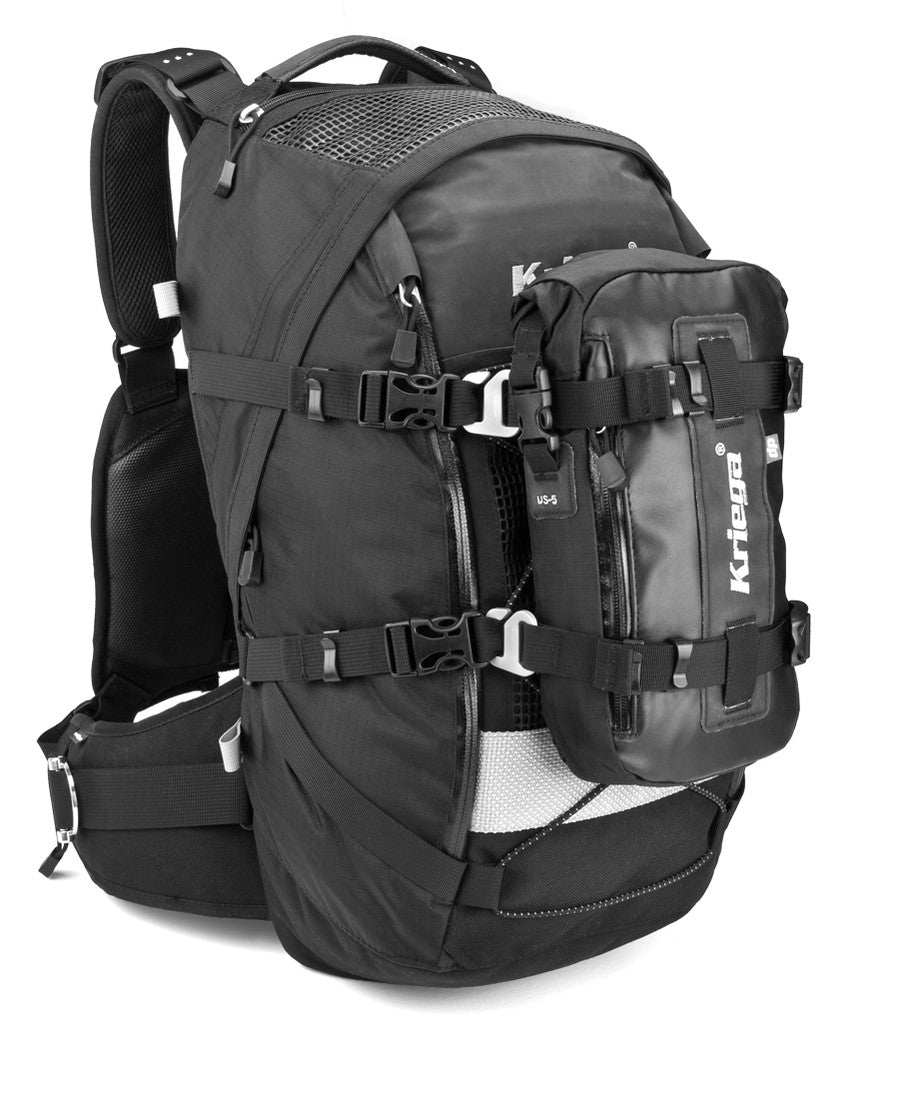 Kriega have made a versatile system allowing you to add either the US5 or US10 Drybag which can provide 5 / 10 litres of extra luggage space. A pocket to install a Forcefield Level 2 Back Protector or a 3 litre Hydrapak water reservoir.
