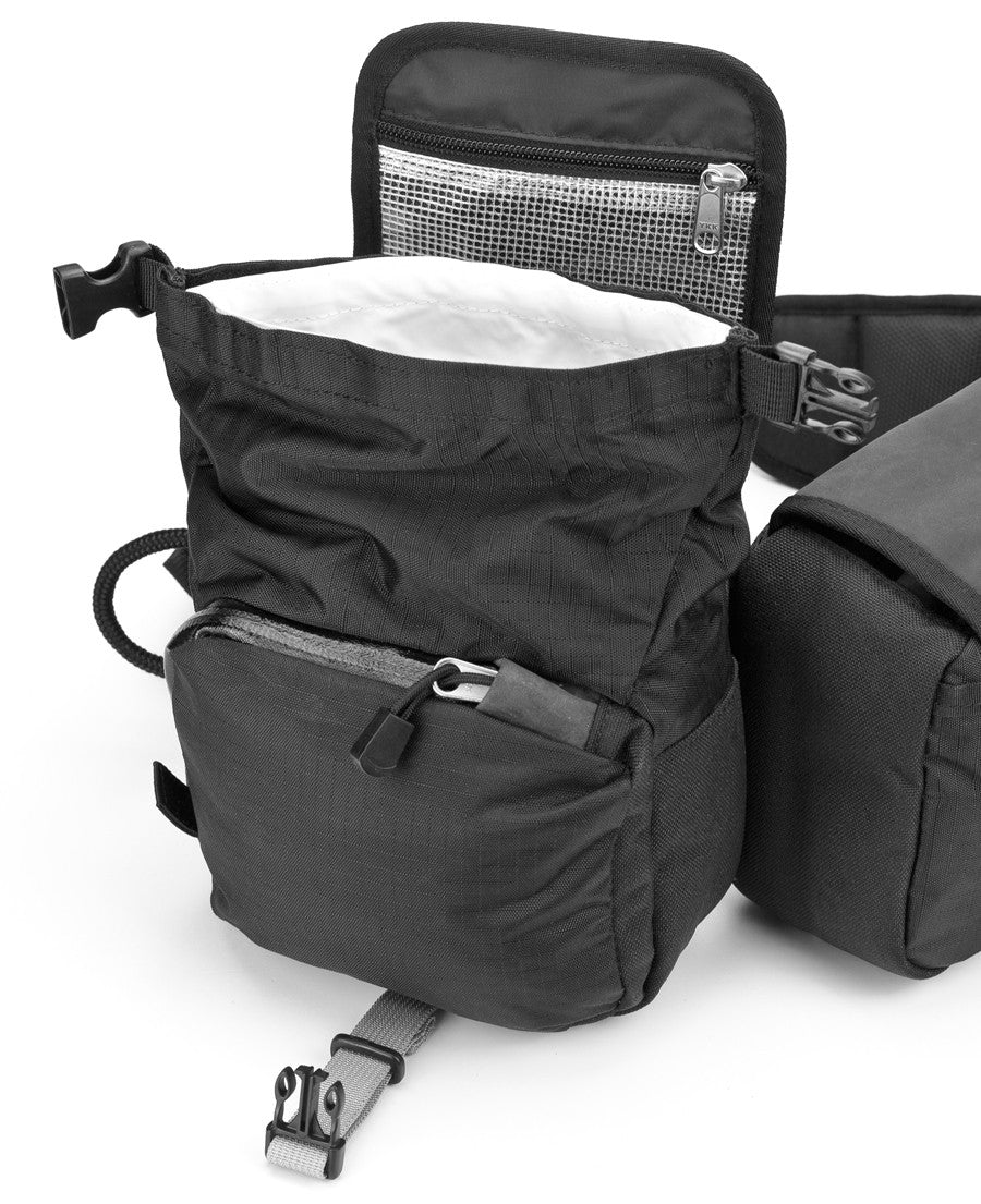 Main compartment: 165(H) x270(W) x 100(D) mm Side-pod: 165(H) x 180(W) x 100(D) mm 8-litre capacity: 6L main body + 2L side-pod 100% waterproof side-pod Water-resistant main body 2 x coated-mesh pockets, 2 x velcro sleeve pockets, internal zipped mesh pocket, removable tool-roll Optional waistbelt pocket |